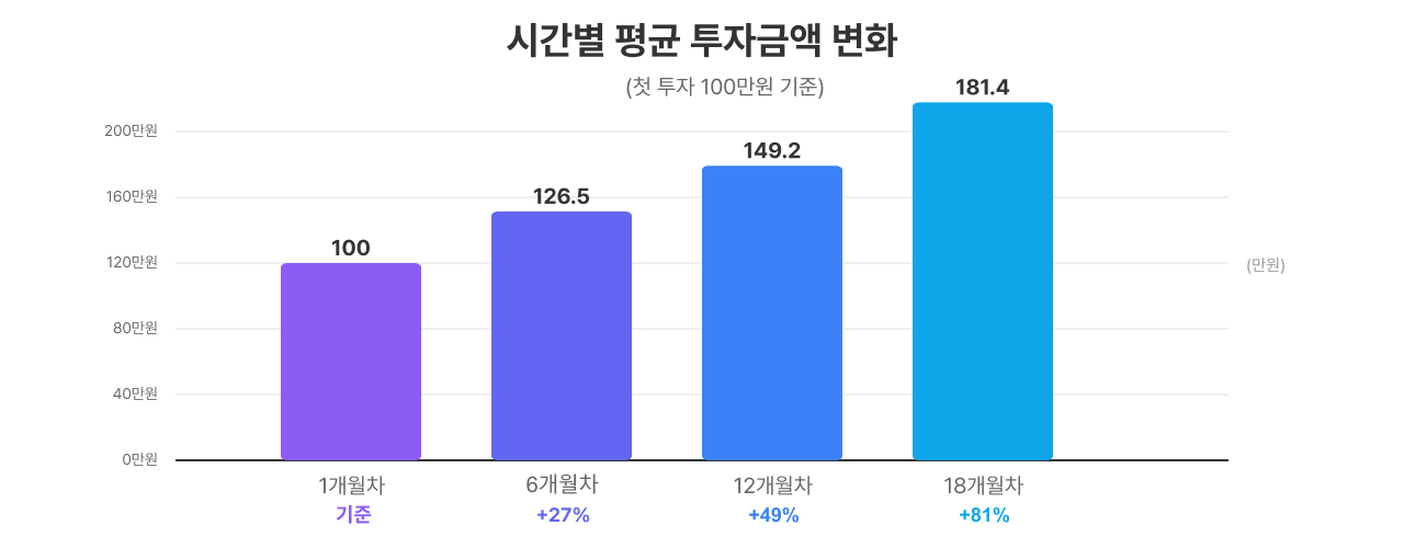 에잇퍼센트를 계속 이용하는 투자자들은, 시간이 지날수록 투자금을 늘립니다. 처음 100만원으로 시작한 투자자의 평균 투자금 변화를 추적해봤습니다.