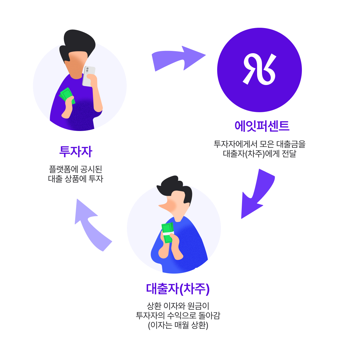 ② 에잇퍼센트 → 대출자(차주): 투자자들로부터 모은 자금을 검증된 차주에게 전달