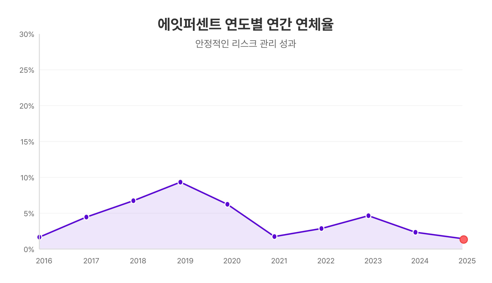 2025년, 에잇퍼센트의 연간 연체율은 1.45%를 기록했습니다. 이는 최근 10년 중 가장 낮은 수치입니다. 이 수치는 단기간의 우연한 결과가 아닙니다.